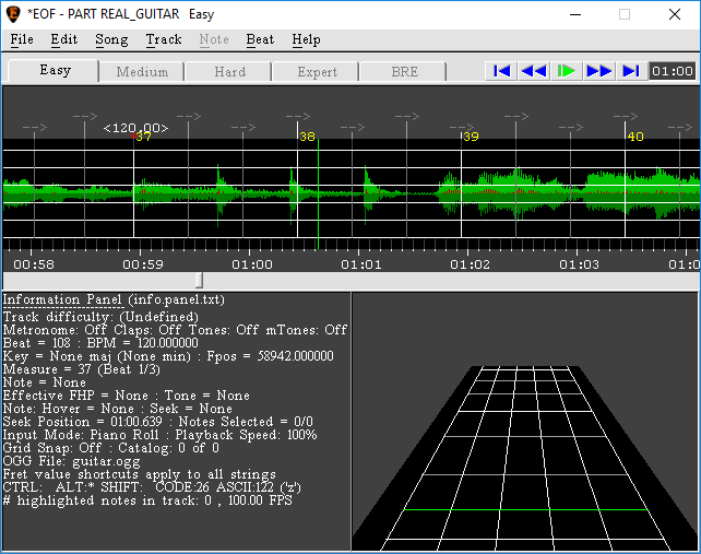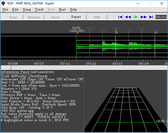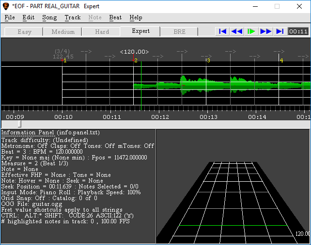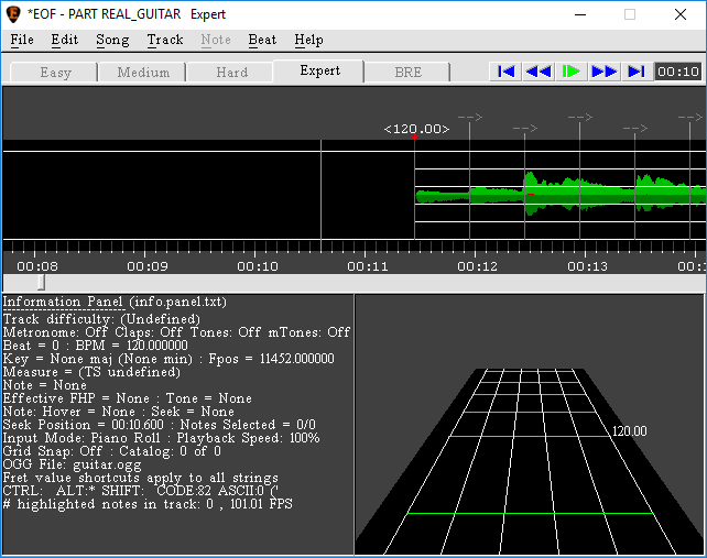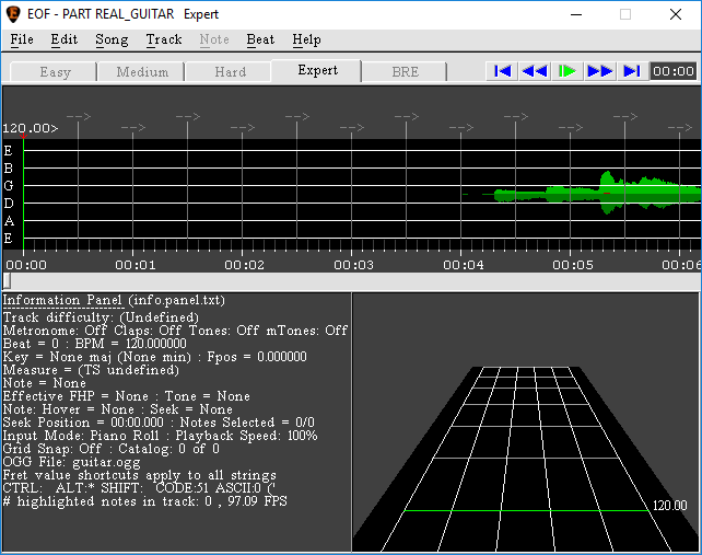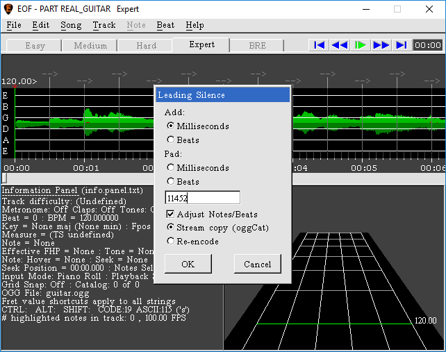An important consideration to keep in mind when adding leading silence is that there must be at least one empty measure on the tempo map4)The grid marking measures and intervals in EOF. before the first guitar or bass note, plus 10 seconds. In the case of anacrusis5)I.e., when the first measure is only partial compared to the time signature), add sufficient leading silence so that the first full measure begins in the right spot.