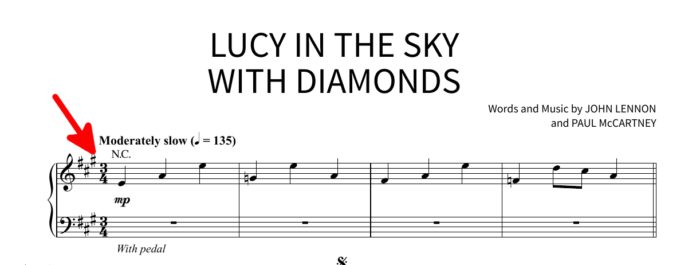 - to two/two on the third measure of ‘eyes’, in ‘… girl with kaleidoscope eyes‘9)This one is a bit tricky. ‘Eyes’ has two measures of three beats followed by one measure of two beats. Unlike the previous cases, there isn’t a change in wording to signal the change in beat!, followed immediately in the next measure by a final change to