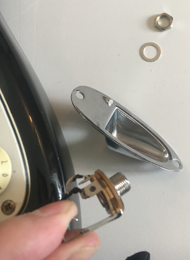 Somehow, the little hex nut which holds the input jack on my Mexican Stratocaster had got loose and fallen off somewhere in the basement. I may find it someday, but there’s a lot of stuff I’d have to move to do that as I have no idea in which area it fell. Ok, well, it was probably due for a replacement anyway, as it buzzed about as though there was some issue with grounding.