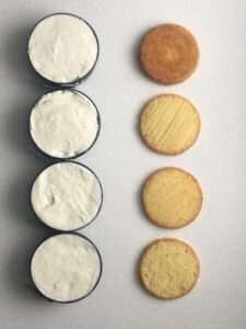 - For each pan, remove the cake bottoms and place the cake tops in their place, flat side down, so that the curved surface faces the centre of the finished cake. The bottoms will in each case be inverted at a later stage so that the original bottom becomes the top of the cake and the cut portion faces the centre.